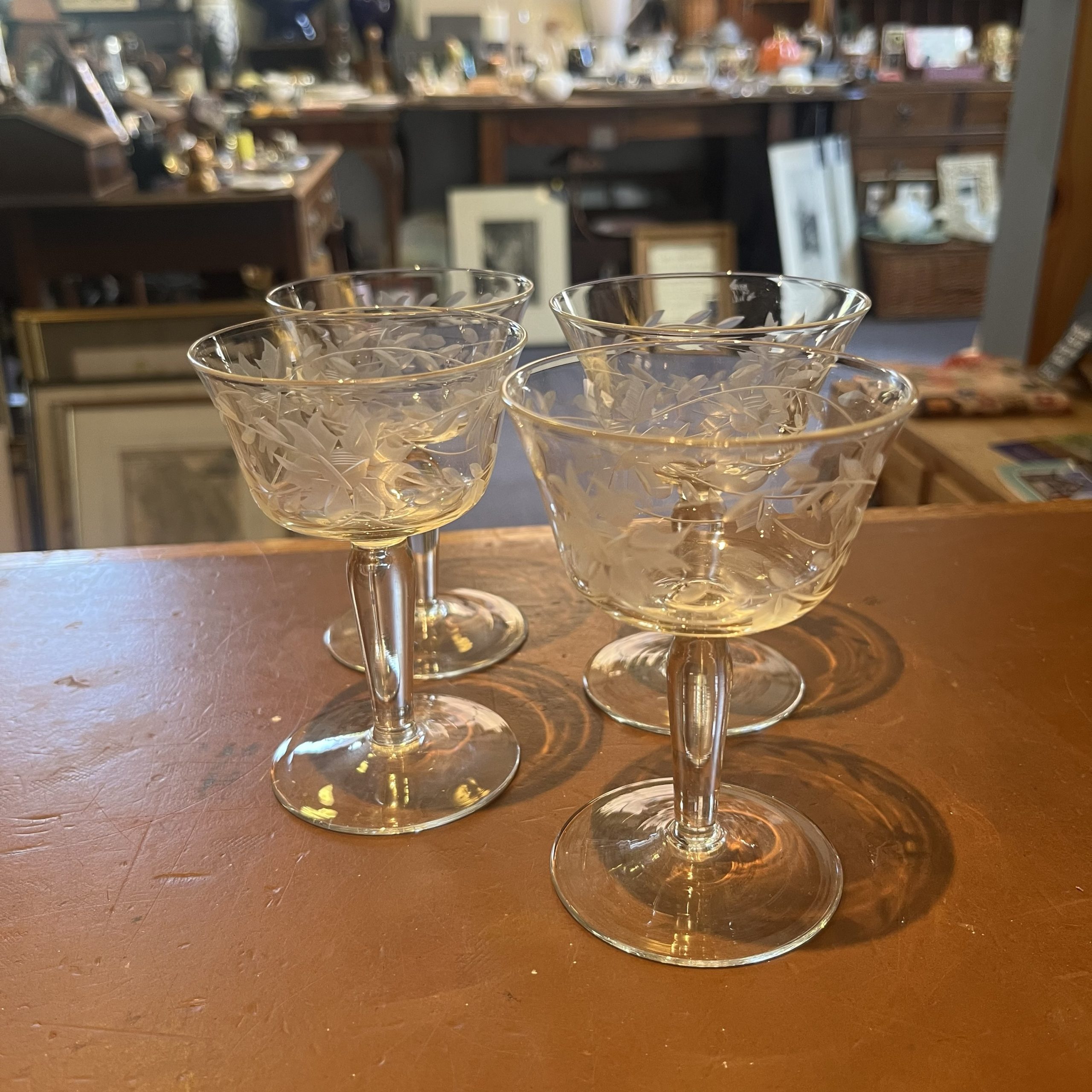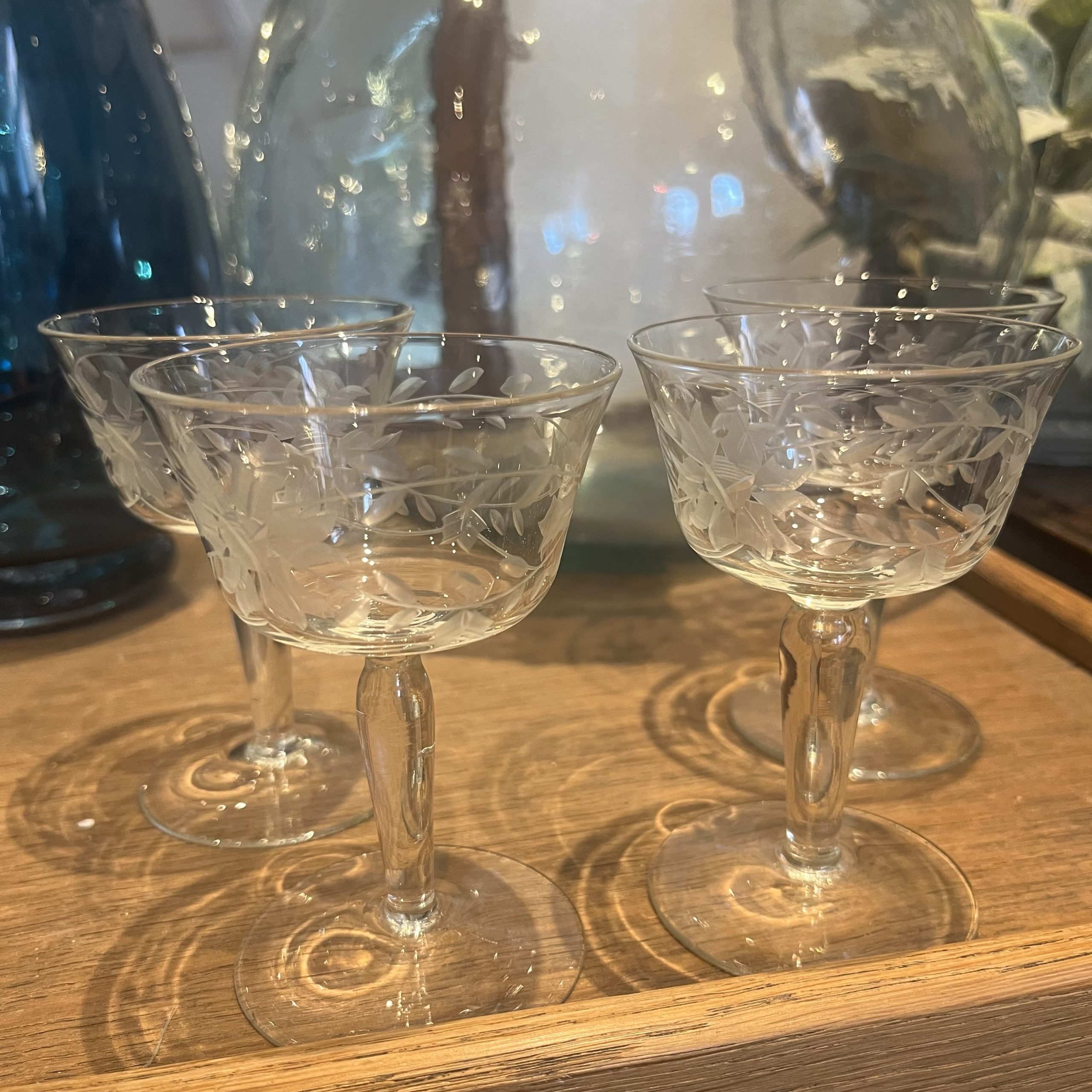 Set of four beautifully etched vintage glasses in a delicate crystal for champagne or aperitifs