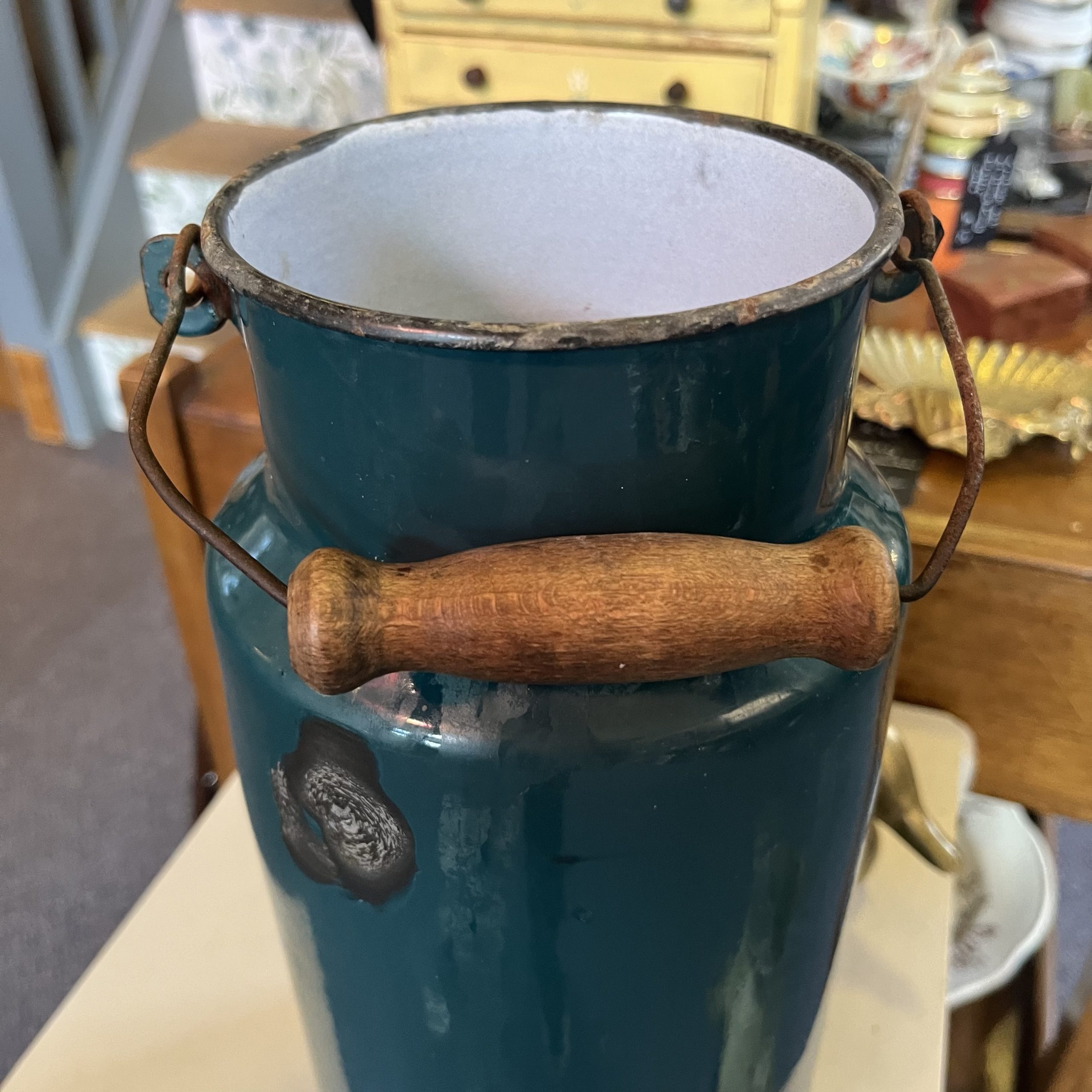 Vintage French enamel churn in a fabulous teal colour – would make a great vase or a little umbrella or stick stand as a good weight to it. Lovely decorative piece.