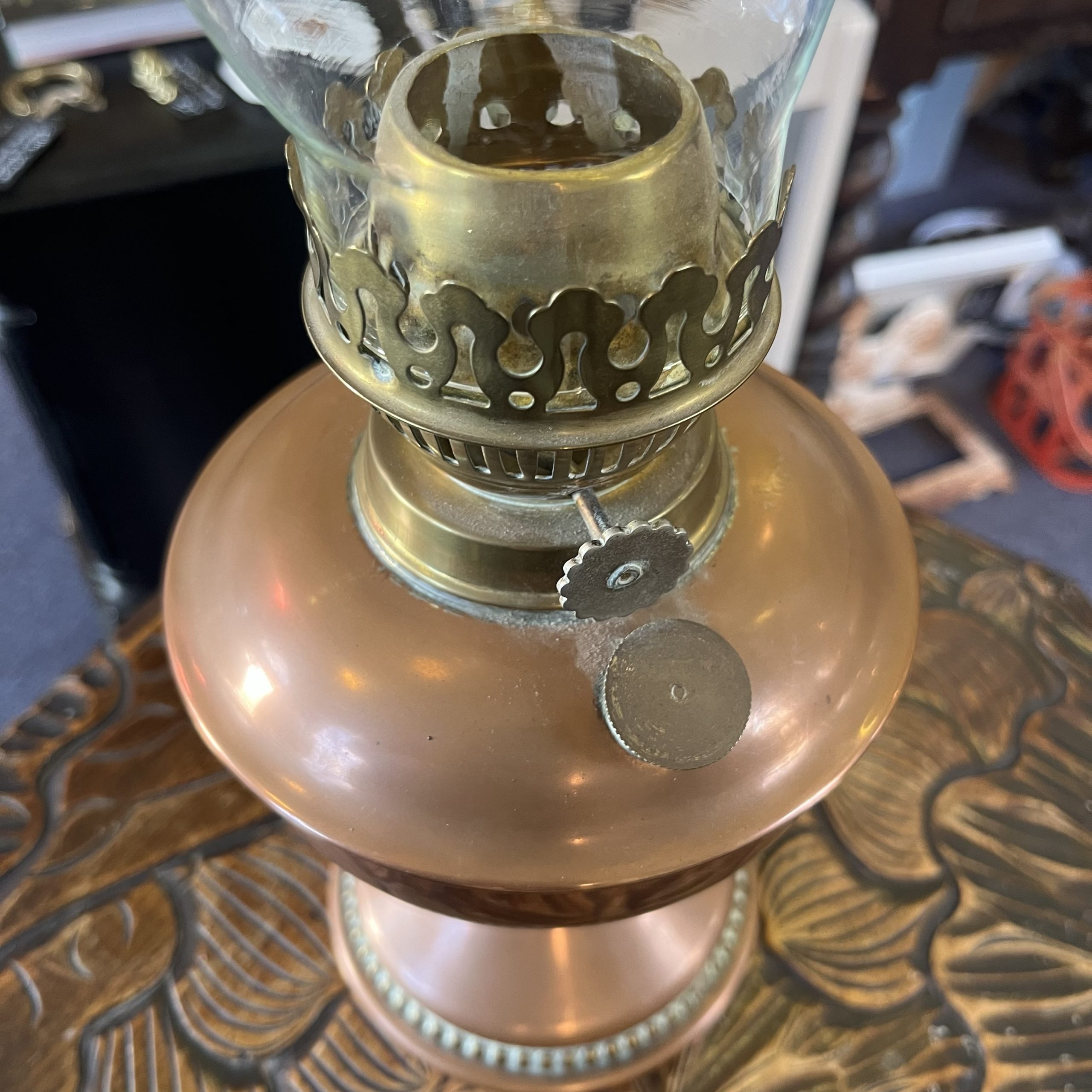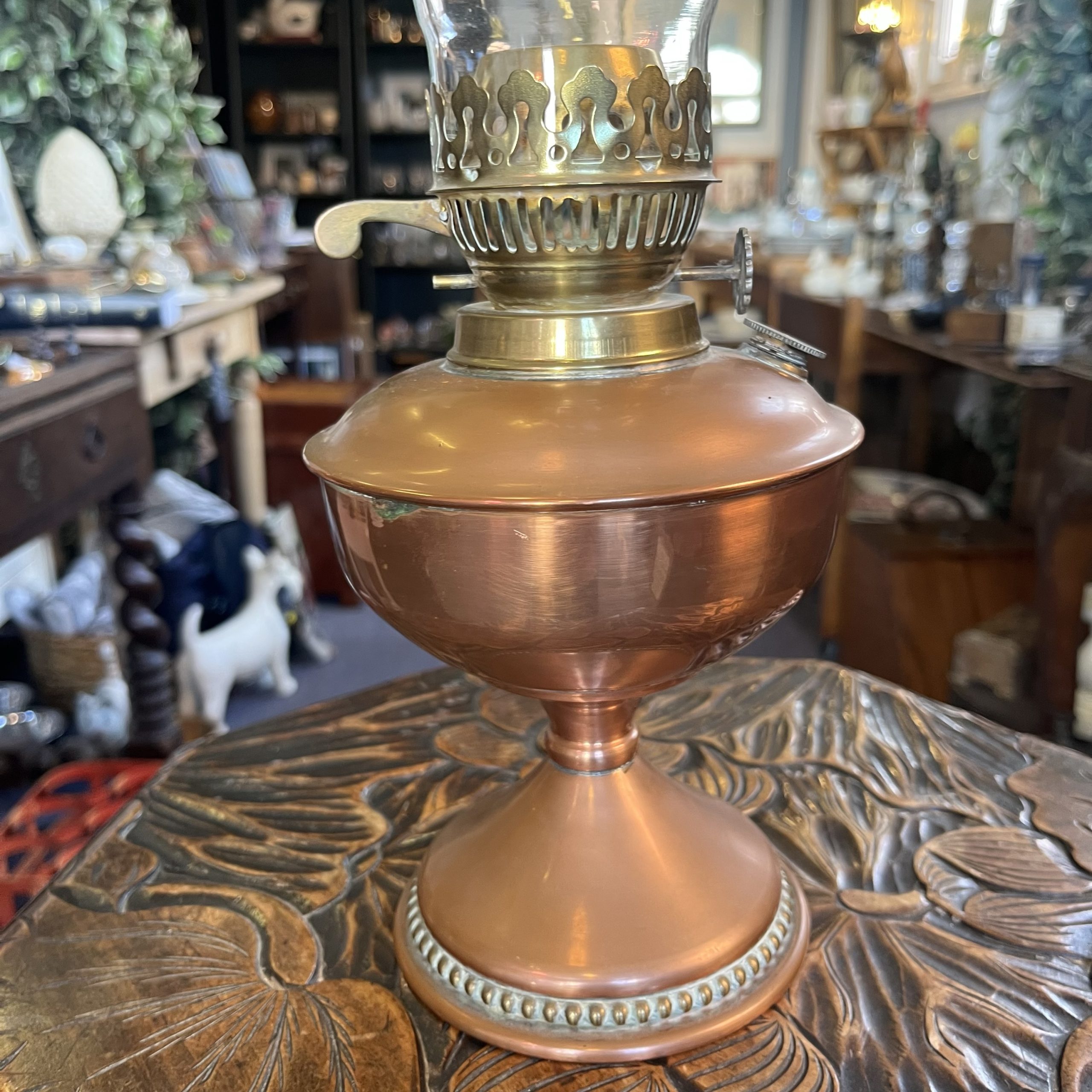 Gorgeous old heavy copper oil lamp with brass embellishments and a beautifully shaped glass chimney.
