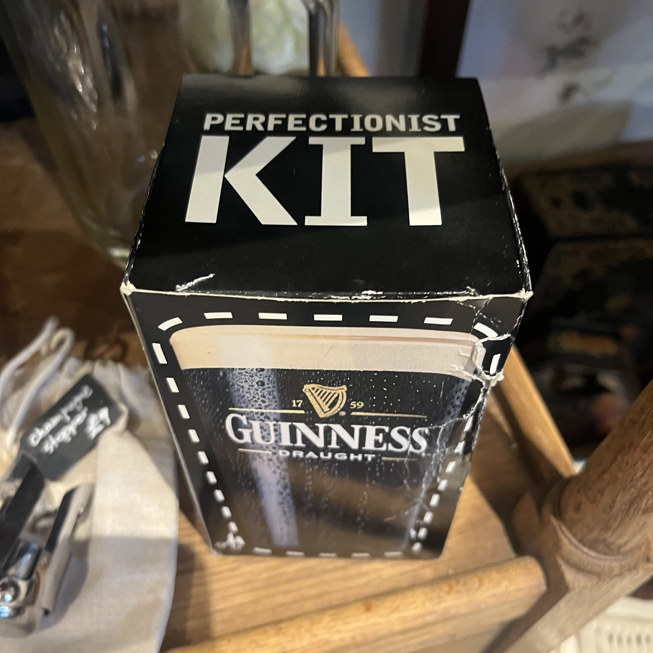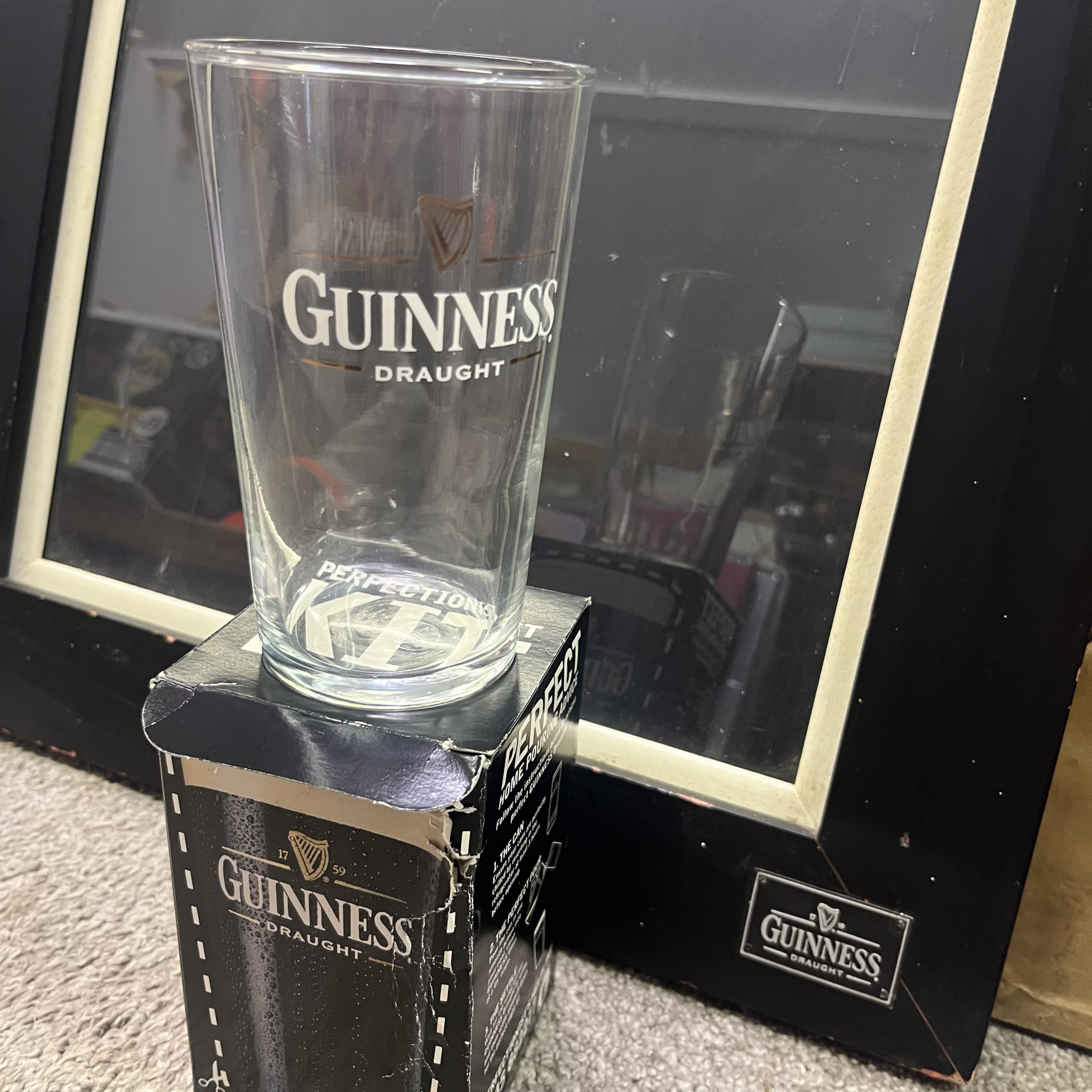 Guinness Glass from the 1990’s presented in a Guinness Perfectionist Box which includes a poster all about pouring the perfect Guinness (now minus the Guiness Can of course but would make a great gift along with a new can of Guinness).