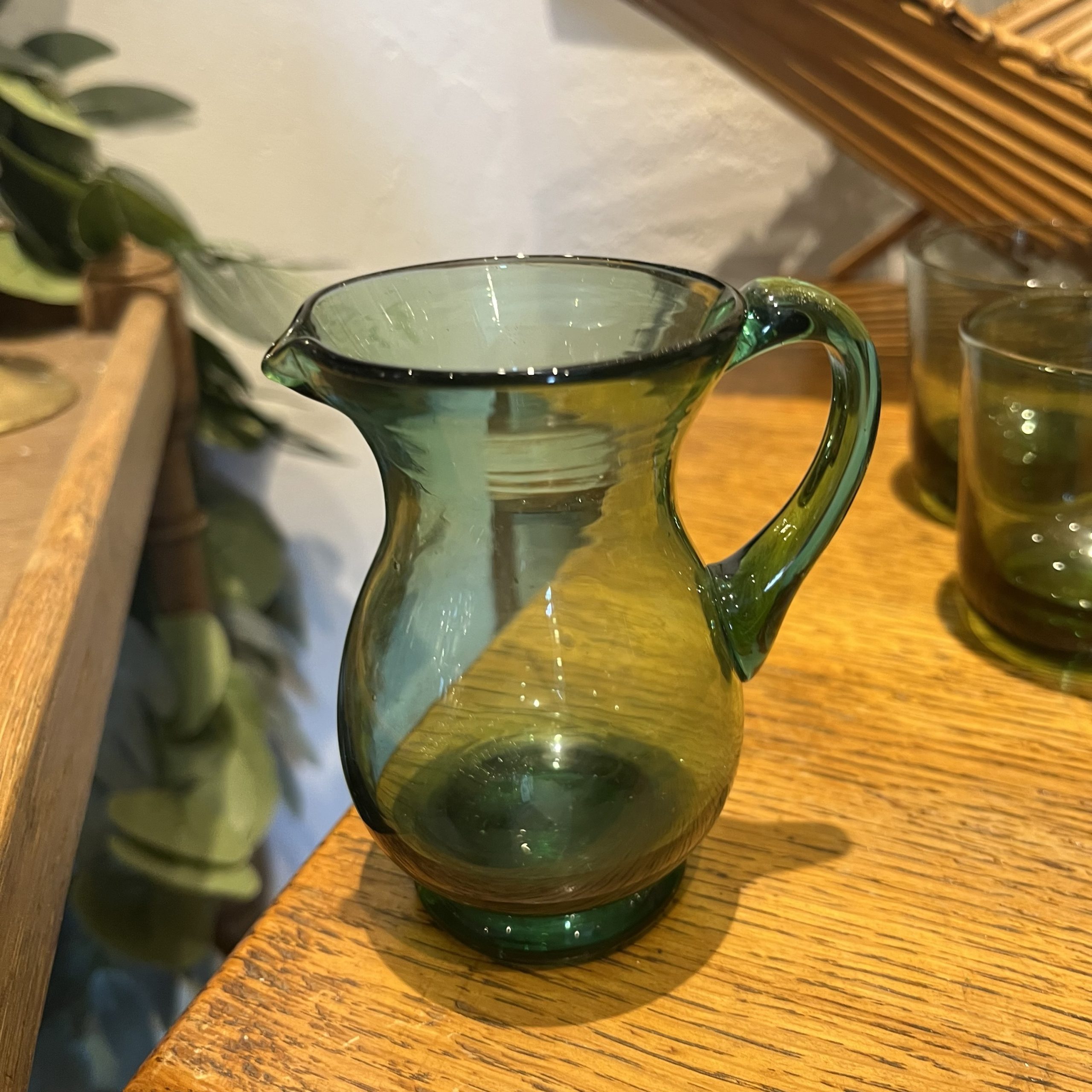 A gorgeous little vintage glass jug in a beautiful emerald green colour. Approx 4 inches high.