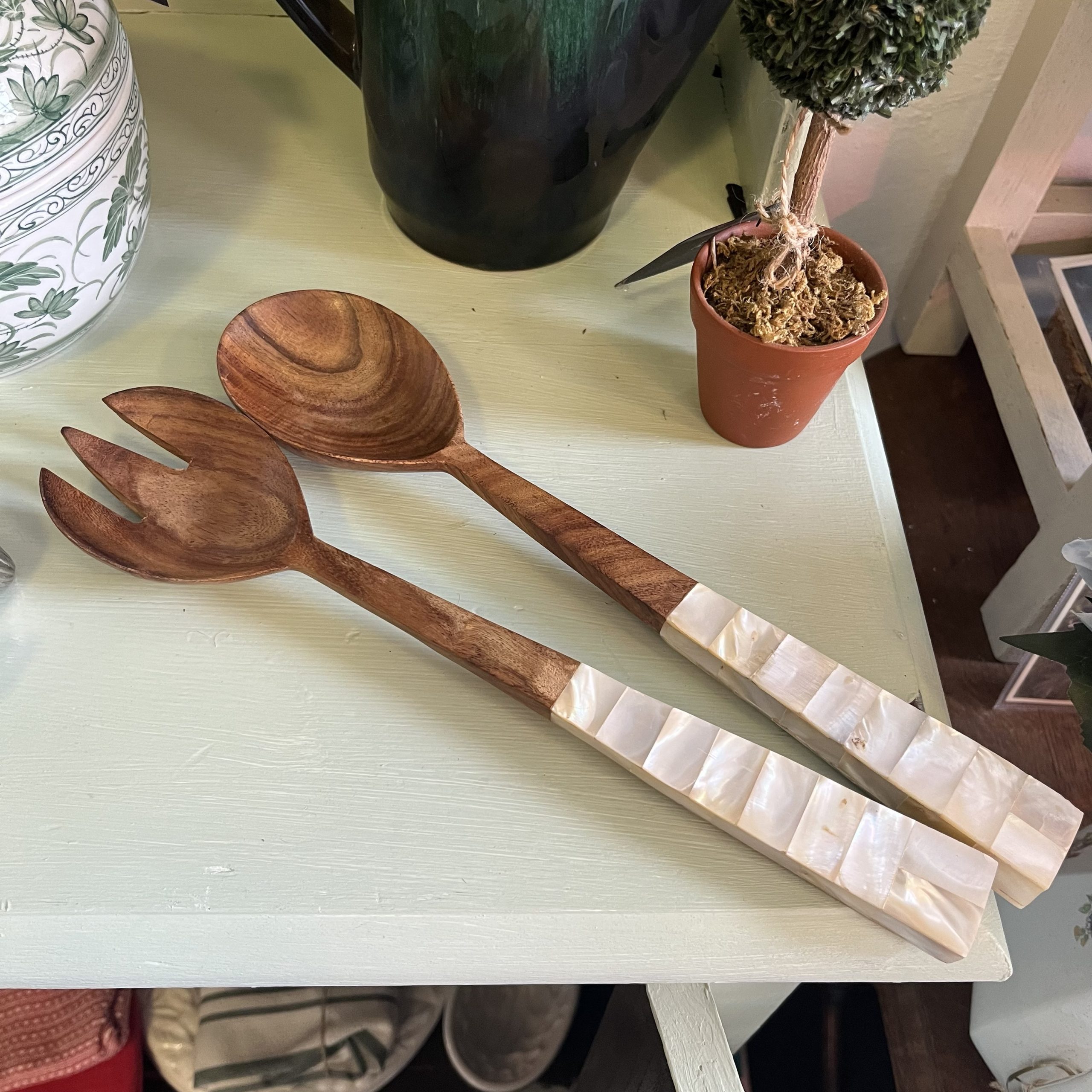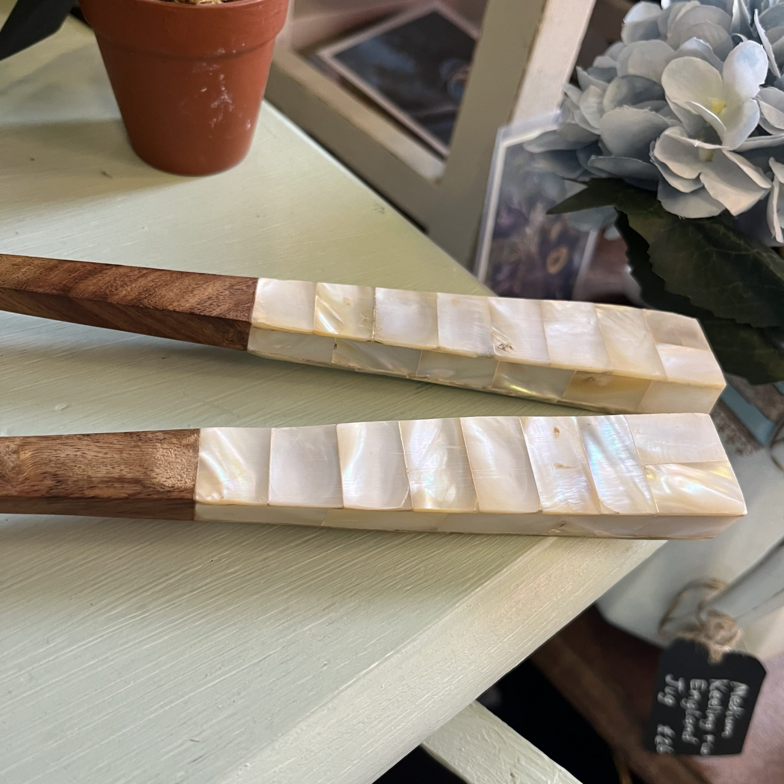 Really lovely and weighty set of wooden salad servers with gorgeous shell handles.