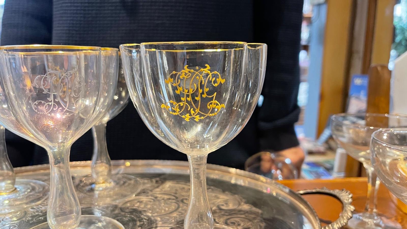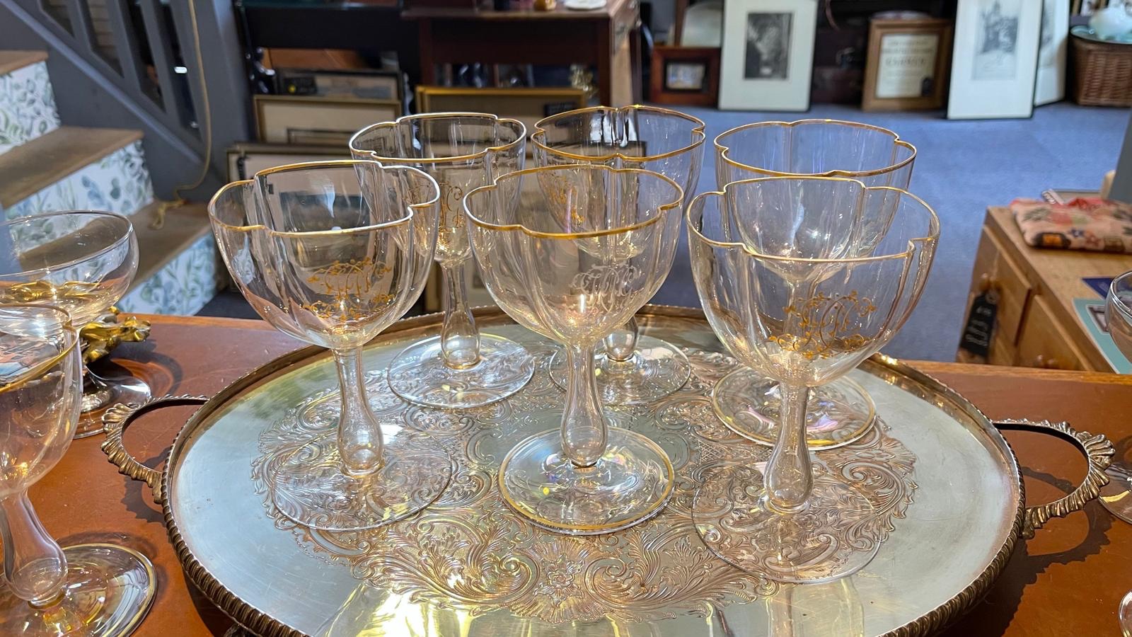 These stunning glasses are a rare find and are a real show stopper. Made of very fine crystal we think from the early 1900’s so could well be classed as antique rather than vintage, gilt edged with a gold crest in a gorgeous fluted design. Set of 5